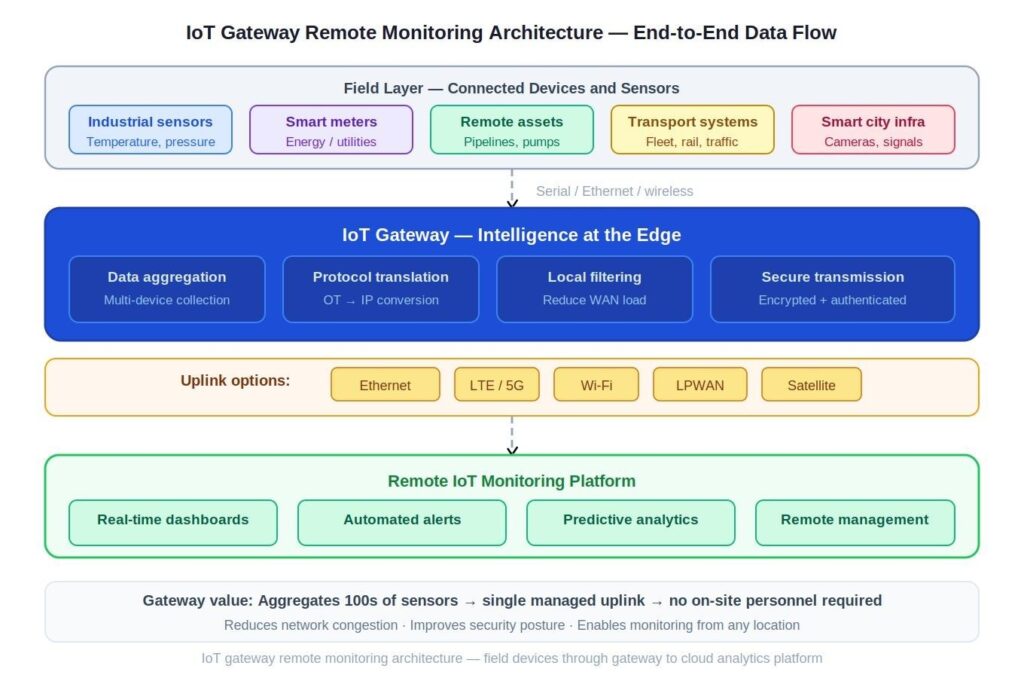 IoT gateway remote monitoring architecture diagram showing field devices through gateway data aggregation and protocol translation to cloud monitoring platform.
